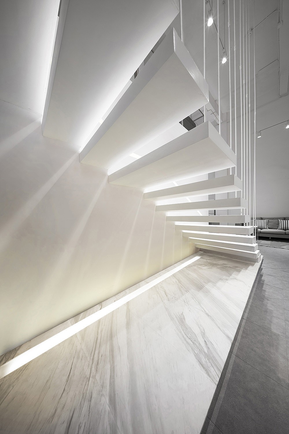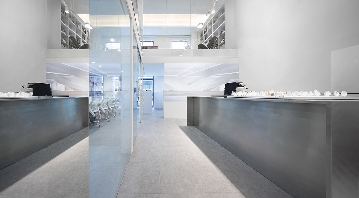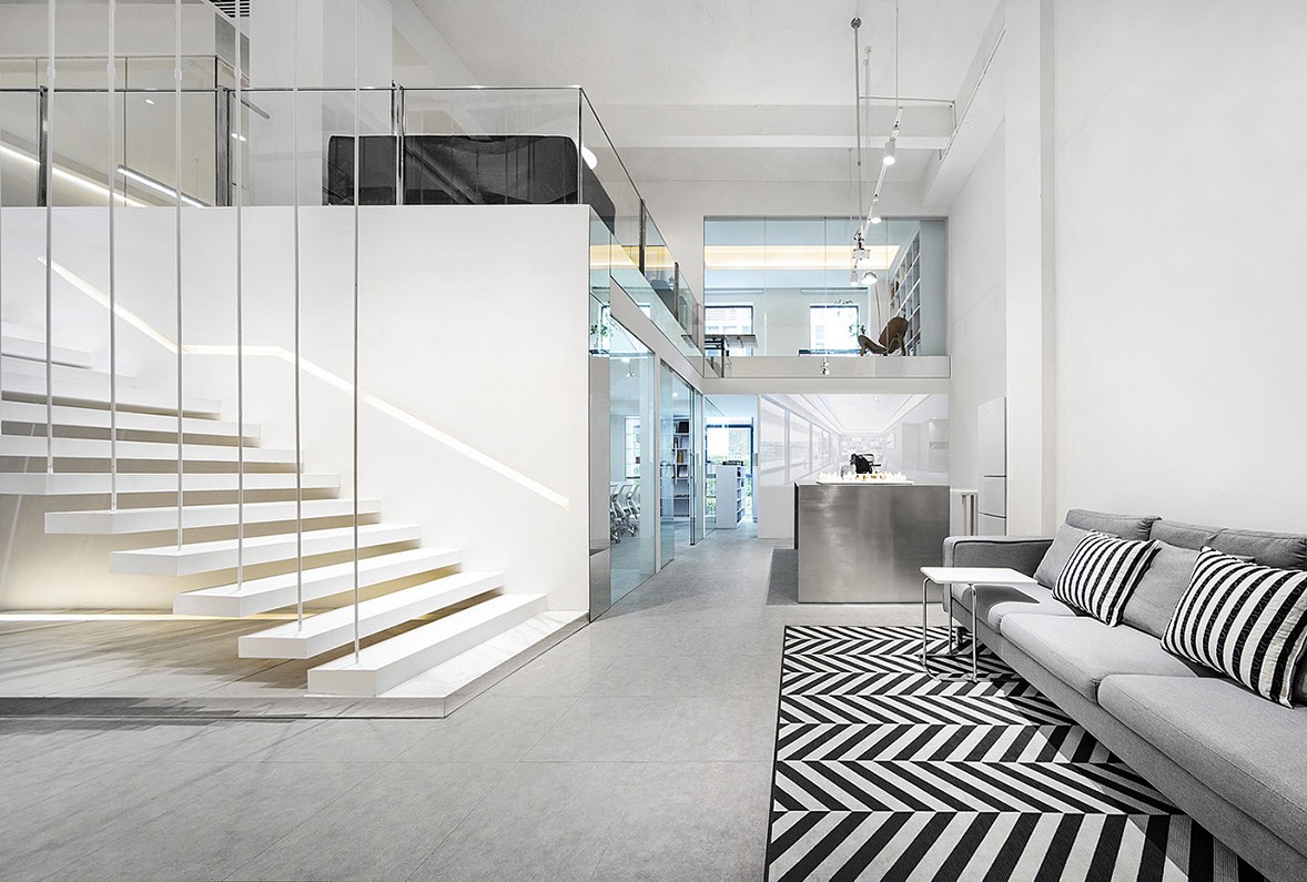 The space uses an open design with a modern feel. Stepping into the front hall, we can see that the top and fa?ade structures cut and intersect geometric figures and lines, seemingly random but full of a sense of order, bringing a touch of uncertainty to the space.